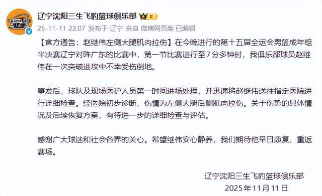 11月11日深夜22点07分,辽宁男篮官方通过社交平台发布了赵继伟的初步伤情检查结果,辽宁男篮在通报中是这样说的——