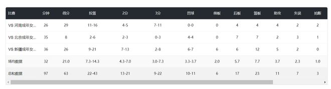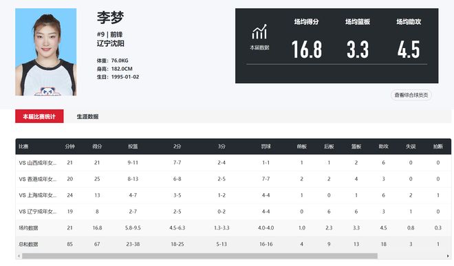 对阵四川女篮的李梦她真的不差,李梦场均21分钟,拿到16.8分3.3篮板4.5助攻0.3抢断,命中率60.5%,三分命中率39.4%。