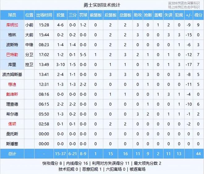 勇士:库明加9分2板3助、巴特勒7分3板2助、库里7分1板、理查德6分、波杰姆斯基5分3板3断、穆迪5分、波斯特3分2板、希尔德2分3助2断、格林2板3助、佩顿2板、戴维斯1板