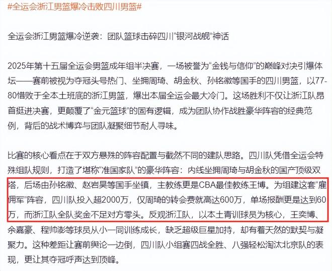 本次四川队的阵容是浙江广厦的班底,也被誉为是本届全运会最强‘雇佣兵’军团,孙铭徽、胡金秋、赵嘉仁、赵岩昊、吴骁、周琦等,主帅更是CBA最佳教头王博,四川为组建这套阵容投入超过2000万,周琦的转会费就高达600万。(这些金额都是网传没有确切的消息,但四川的确是耗费巨资)