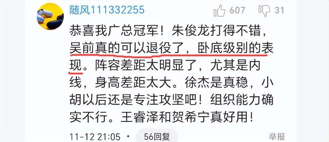 吴前不只是在决赛表现拉胯,而是多场拉胯。半决赛战四川6中1,战上海7中2.,小组赛战广东6中2,多场得零星几分,场均命中率只是二成,没有打出顶薪球员的价值。球迷评论,“吴前真的是不行了,一上防守强度他居然投了个14中1。我怀疑他的年龄可能有造假,否则他这个年龄不可能打不动了。”、“难怪吴前,原帅这种货色进不了国家队”。球迷认为:吴前可以退役了。我也认为,他就好好当他的助理教练吧,别再兼当队员了。你们说呢?