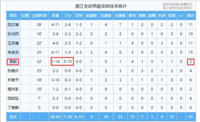 作为主力的吴前昨晚没有帮上球队,没有带好头,表现比王奕博和朱俊龙差多了,浙江队大输36分他难逃责任,全场梦游和瞎投,交出了惨不忍睹的数据,打了32分钟,居然是14投1中,三分球10投0中,只得到可怜的2分。吴前如果有50%的命中,比赛都不会输得这么惨。奇怪的是他在颁奖时却笑得非常开心。