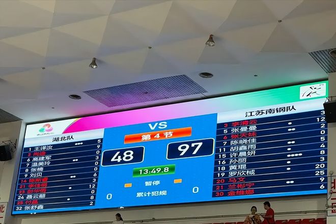 另一场比赛江苏队97比48大胜湖北队晋级四强,也是一支强队。湖北队只有彭华倩得分上双,她得到12分4篮板,付晶8分4篮板6助攻。江苏队阵容强大,国手罗欣棫打了17分钟就得到20分11篮板,张曼曼12分2助攻,马文25分6篮板,金维娜6分,许晨妍只打了5分钟得到4分5篮板,主动卸任主帅专职球员的38岁老将陈晓佳也打了6分钟没有得分进账收获2篮板2助攻。胡鑫雨5分8助攻4抢断4篮板,李清云3分9篮板。