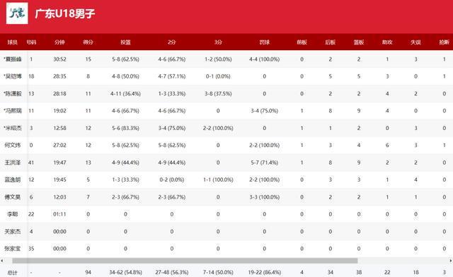 数据方面:广东6人得分上双,夏振峰15分、王洪泽13分9篮板、米绍杰12分、何文炜12分4篮板6助攻、冯熙瑞11分9篮板4助攻、陈潇毅11分4助攻。