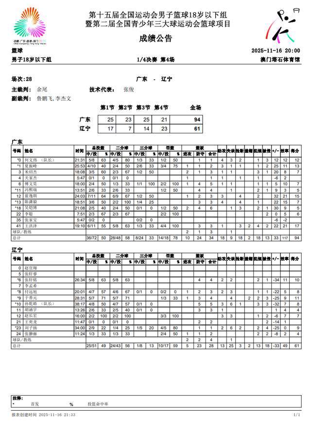 94-61!又一场辽粤大战,结果以广东U18男篮的胜出而告终,赢了33分之多,凸显了广东男篮青训的强大。吴庆龙出马也没招啊,终究未能率领辽宁队更进一步。