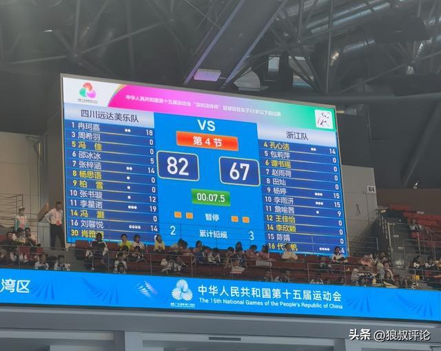 第四节,随着浙江外线投篮持续低迷,四川则是有意控制时间,冉珂嘉抢断一条龙2分打中,四川创造16分的领先优势,比赛悬念正式告一段落,最终,四川以82-67击败浙江男篮,夺得本届女篮全运会U22组金牌。