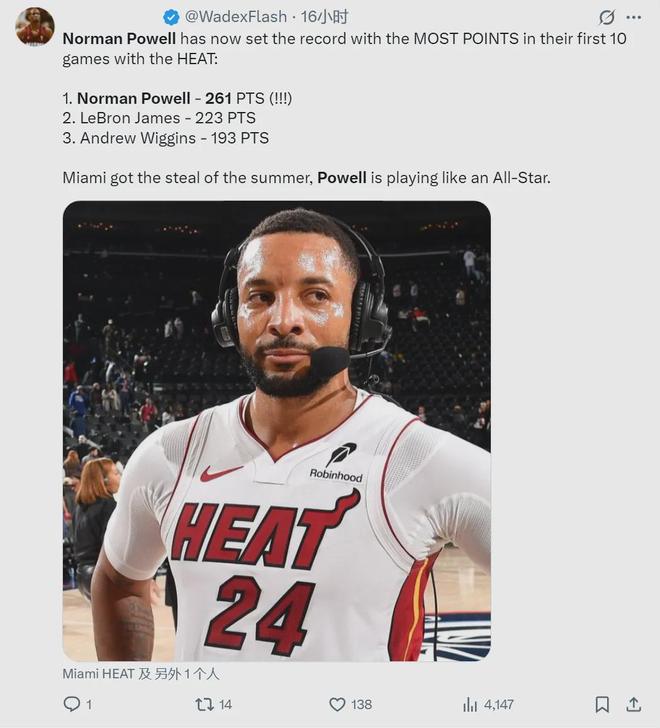 热火后卫诺曼-鲍威尔爆发了,过去3场比赛,场均砍下32.7分3篮板2.3助攻,投篮命中率50.8%,三分命中率50%,罚球命中率91.3%。此外,鲍威尔热火生涯前10场比赛一共砍下261分,超过詹姆斯的223分,高居热火队史第一。