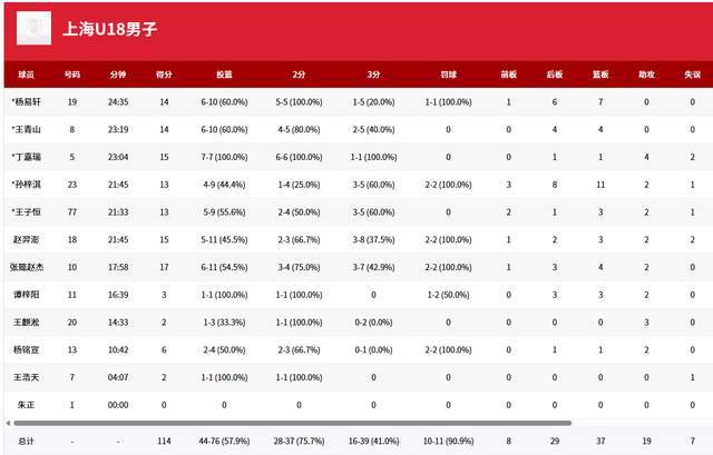 再看人家上海队,全队7人得分上双,杨易轩14分7篮板,王青山14分4篮板,丁嘉瑞15分4助攻,孙梓淇13分11篮板,王子恒13分3篮板,赵羿澎15分3篮板,张懿赵杰17分4篮板。