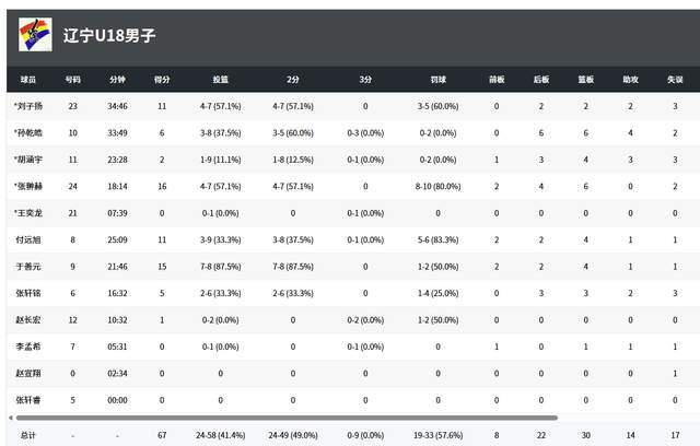 辽宁队4人得分上双,张翀赫16分6篮板,刘子扬11分,付远旭11分4篮板,于善元15分4篮板。