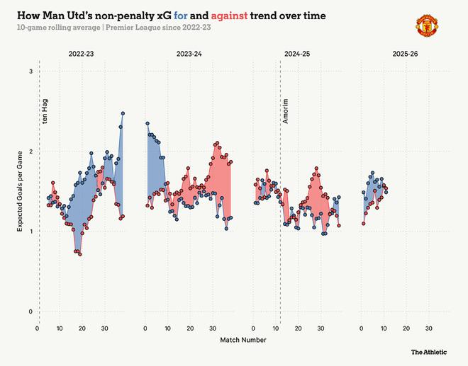 曼联的总体方向是向上的,如下面这张详细显示球队随时间推移的预期进球和预期失球数据图所示。要达到滕哈赫执教第一个赛季任期的高点仍有工作要做,但在长期处于导致换帅的红色负值区域之后,代表正向差异的蓝色区域已变得更加明显。