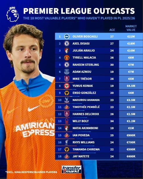 北京时间11月19日,德转统计出了本赛季至今英超联赛0出场球员的身价榜,布莱顿的后卫博斯卡利以2200万欧元的身价排名第一,迪萨西、马拉西亚以及斯特林也都榜上有名。