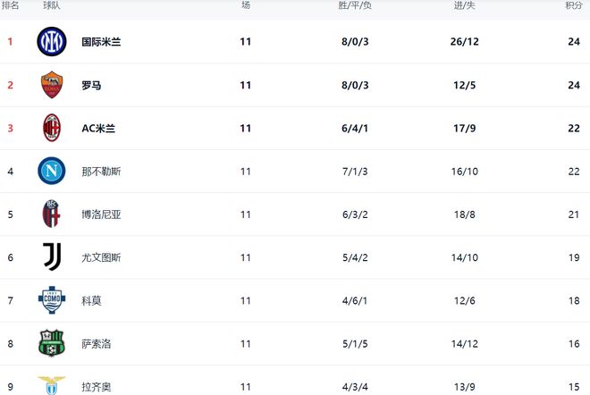 这一轮比赛全部踢完,积分榜易主,国际米兰8胜3负,拿到24分,登顶积分榜。罗马的战绩和国际米兰一模一样,也是24分。但是,罗马的净胜球只有7个,而国际米兰的净胜球有14个。因此,罗马只能屈居第2。AC米兰排名第3,拿到22分。输球的那不勒斯也是22分,排名第4。博洛尼亚则升到了第5名,把尤文图斯挤了下去。尤文图斯只拿到19个积分。