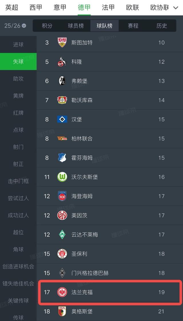 在德甲赛场,法兰克福9轮联赛失球19粒,是本赛季德甲失球第二多的俱乐部,奥格斯堡以21粒失球为德甲目前失球最多的俱乐部。